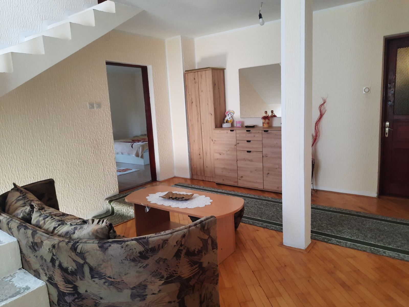 Kuća sprat:hodnik,kotlarnica,kupatilo,dve spavaće sobe sa izlaskom na zatvorenu terasu,dnevni boravak sa kuhinjom i trpezarijom sa izlaskom na otvorenu terasu.