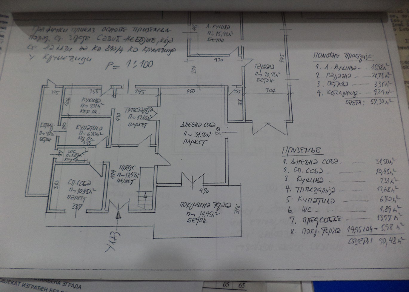 U prizemlju kuće se nalazi velika dnevna soba, trpezarija, kuhinja, spavaća soba, veliko kupatilo sa wc šoljom i posebno wc kao i hodnik sa plakarima i stepeništem za potkrovlje na kome su vrata i ispod koga je ostava.