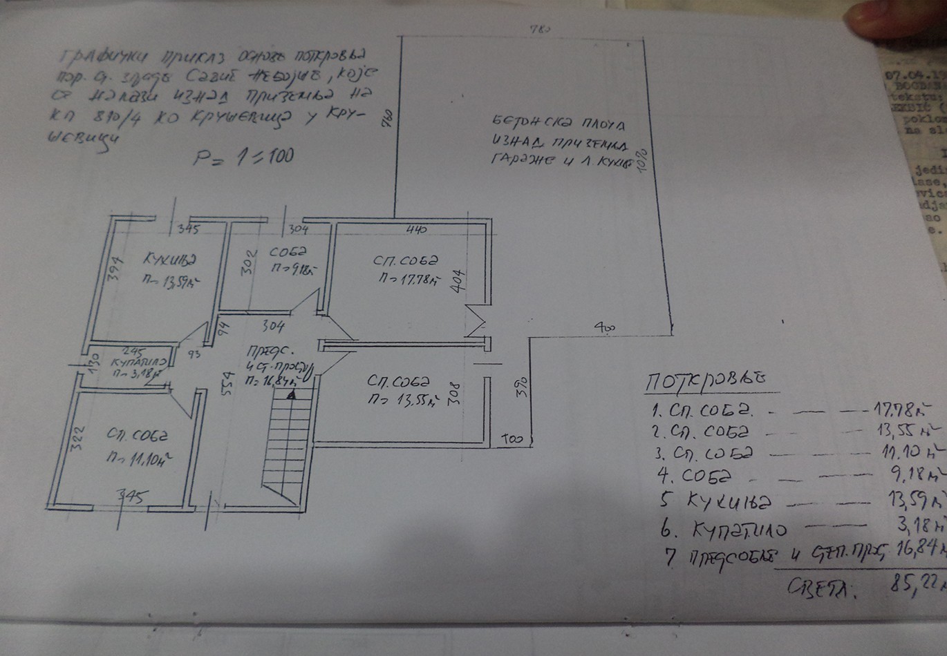 Potkrovlje je visoko tako da je iskorišćena kompletna površina ploče, sastoji se od 5 soba, velikog hola i kupatila iznad koga je tavan. Od jedne sobe je trenutno napravljena kuhinja sa trpezarijom, od jedne dnevna soba iz koje se izlazi na veliku terasu od oko 60m2 koja se nalazi iznad ekonomskog dela na kojoj može da se napravi još jedan stan, tako da je praktično moguće da žive 3 porodice nezavisno.